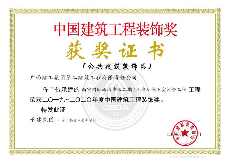 • 南寧國際旅游中心二期1#樓及地下室工程榮獲國家裝飾獎