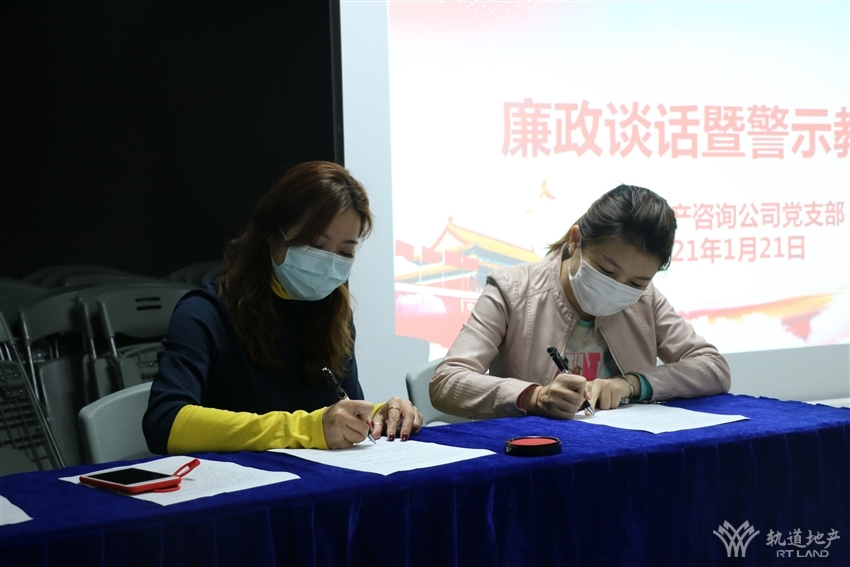 活動中,軌道地產(chǎn)咨詢公司黨支部書記、董事長劉燕組織與會人員學習了《關(guān)于兩起違反中央八項規(guī)定精神問題典型案例的通報》等相關(guān)文件,并集中觀看了警示教育片《縣委書記為何滑向深淵》。軌道地產(chǎn)咨詢公司各部門、各項目負責人還與黨支部書記劉燕簽訂了《黨風廉政建設承諾書》。